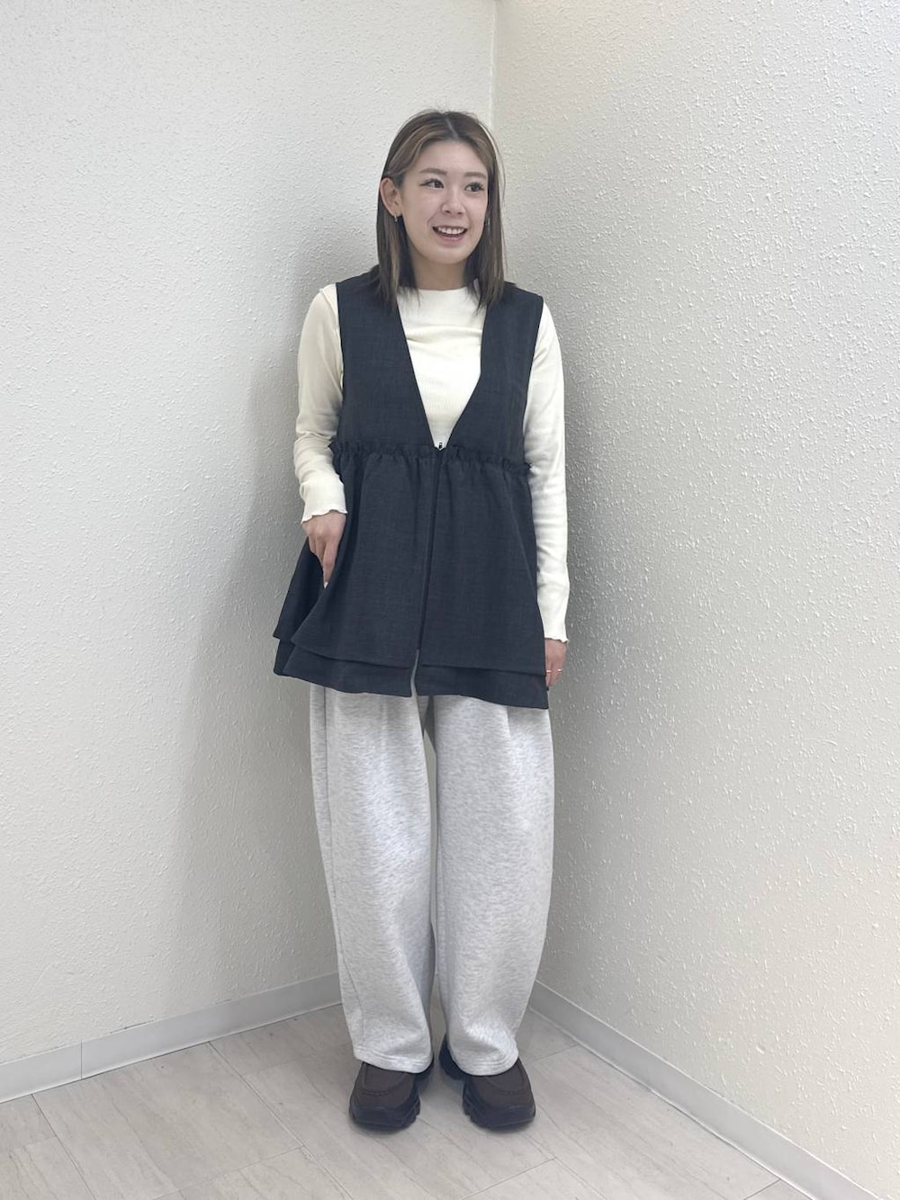 Vネックベストで縦ラインを強調 スウェットパンツ合わせでも ラフすぎないバランスに🖤 デイリーに真似しやすいレイヤードコーデ