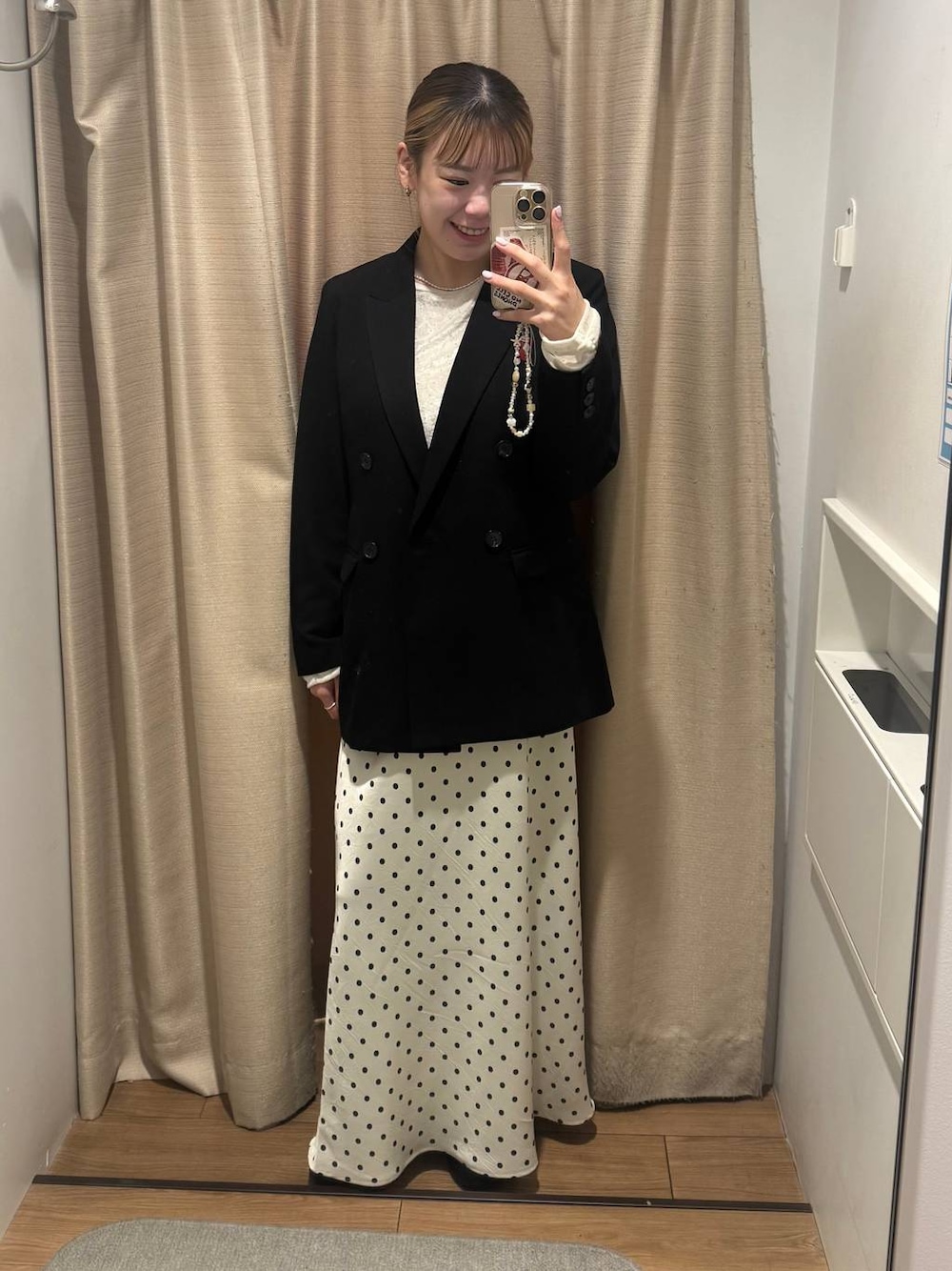 オケージョンジャケットを 普段使いコーデに着回し✨️ スカート合わせコーデ🖤 ドットスカートでカジュアルダウン 着回し力優秀すぎるこのアウター細見えも叶えてくれるよ!