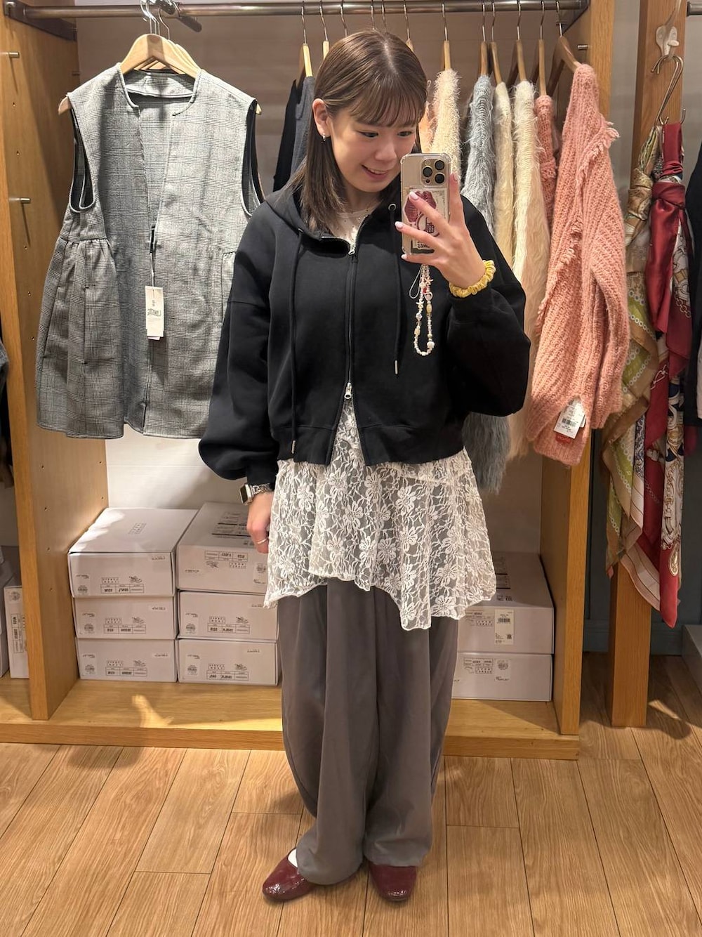 店頭コーデ レース取り入れて春先取りコーデしてみたよ! トップスFサイズ着用 ボトムスMサイズ着用