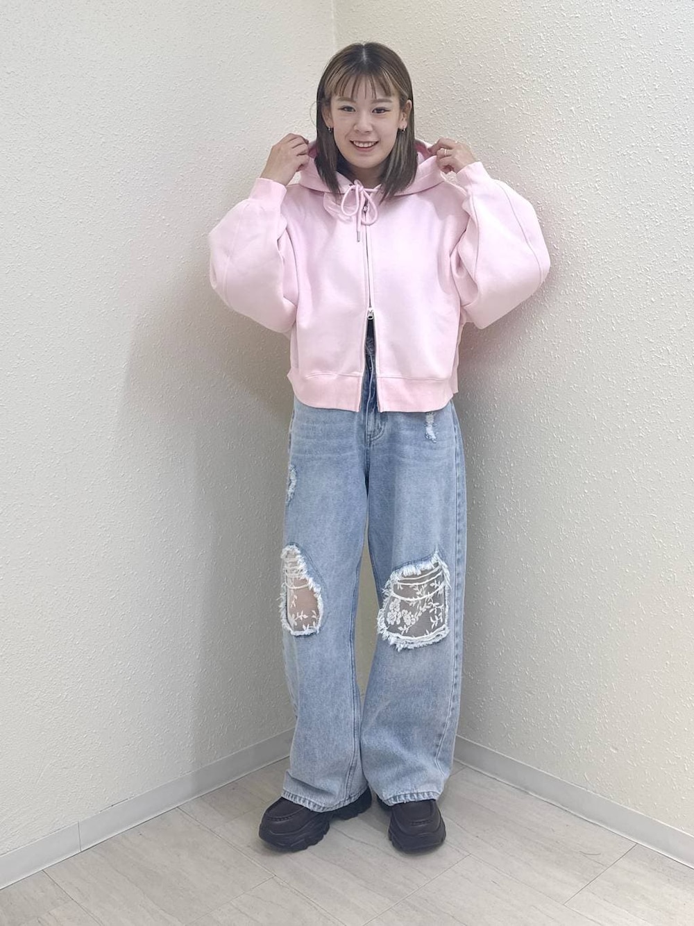 ピンクフーディ×レースデニムがかわいすぎる 春先取りコーデ♡