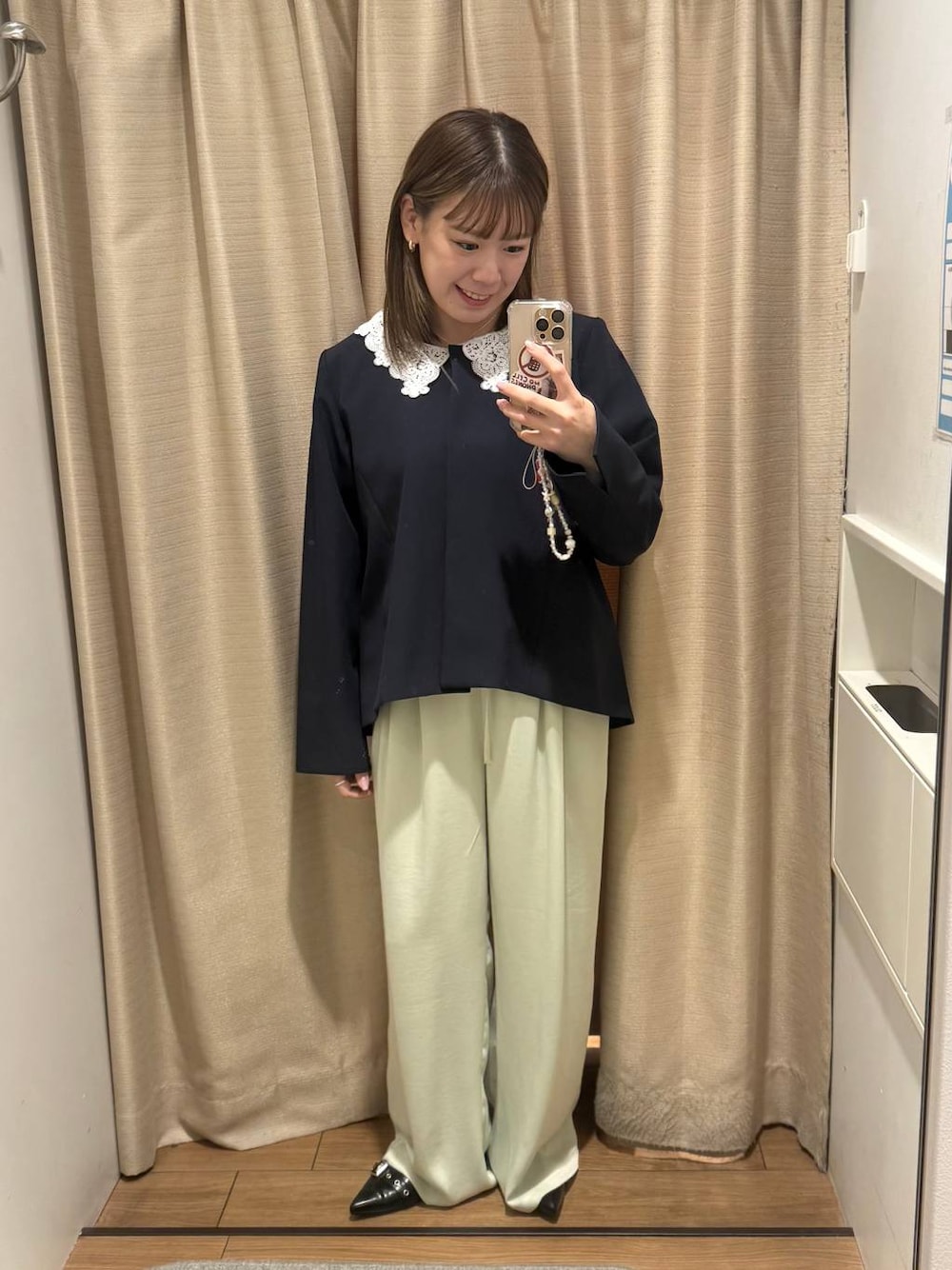 オケージョンアイテムコーデ 🔍クルージャケット オケージョンやお呼ばれシーンにぴったりな取り外しのレース衿が付いたジャケット。 適度なストレッチ性を持ちながら、ハリとドレープ性を兼ね備えた素材感が魅力です☺️ レース衿を取ると、首元がすっきりと見えるノーカラージャケットになります🙆♀️ 🔍ストレッチサテンイージーパンツ タックの入った程よい綺麗なワイドシルエットで、 カジュアルからきれいめまで合わせるものを選ばないサテンパンツです! ウエストはゴム仕様で、紐で調節ができます🙆♀️ 154センチ トップスMサイズ着用 ボトムスMサイズ着用