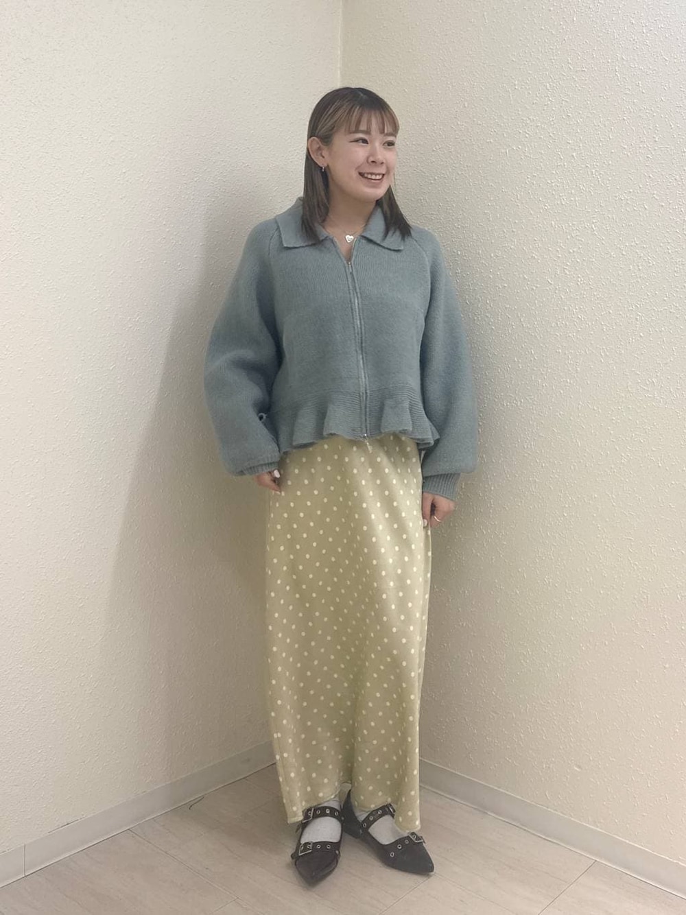 春っぽカラー合わせが可愛い🌷 ペプラムシルエットで スタイルアップも叶う◎ ドットスカート合わせで 甘さプラスした大人フェミニンコーデ。