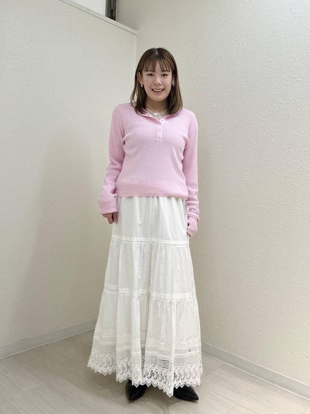 トレンドのヘンリーネックトップスで シンプルやのにちゃんとおしゃれ見え◎ コンパクトなサイズ感で着痩せもできて、 ふんわりスカートと合わせるだけでバランス最強 甘めコーデやけど、 程よくカジュアル感あるのが今っぽいポイント✔️