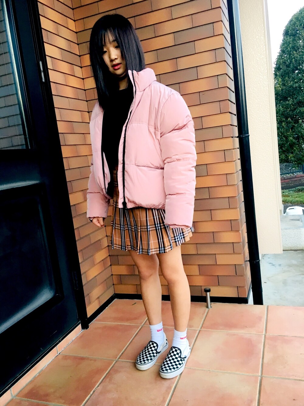 ショッピングへ 流行りの物ばかり ショートダウン チェックプリーツスカート