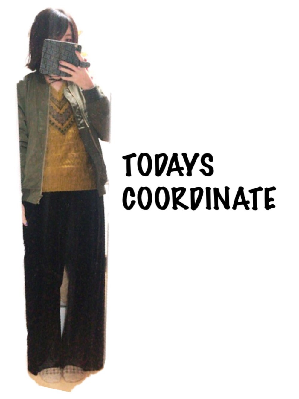 グリーン系のブルゾンを着用したレディースの冬コーディネートの1枚目の写真