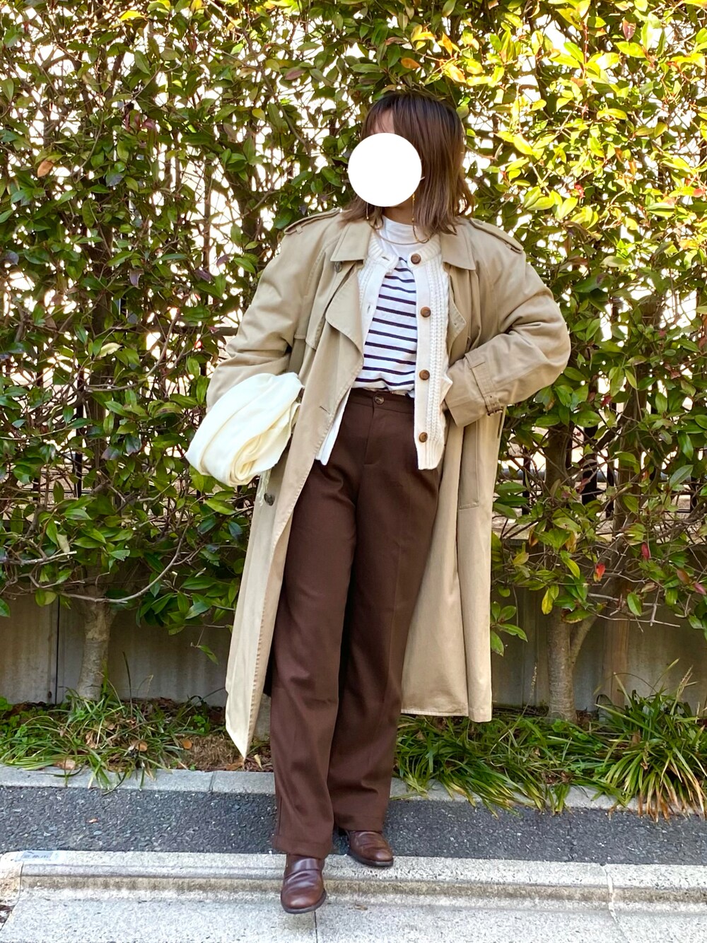 SHEINのパンツをメインに優しい色味でまとめてみました 🧸 スラックスとトレンチコートのかっちりさに、白のほっこりニットとボーダーのトップスでカジュアルさをプラスした、ヨーロッパガールの休日をイメージしたコーデです 💭