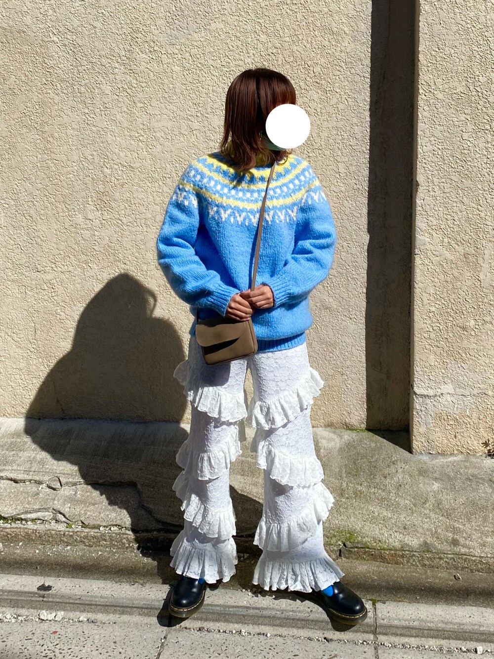 春色の古着のニットにPOPPYのフリルパンツを合わせたシンプルだけど一癖あるコーデです 🦢