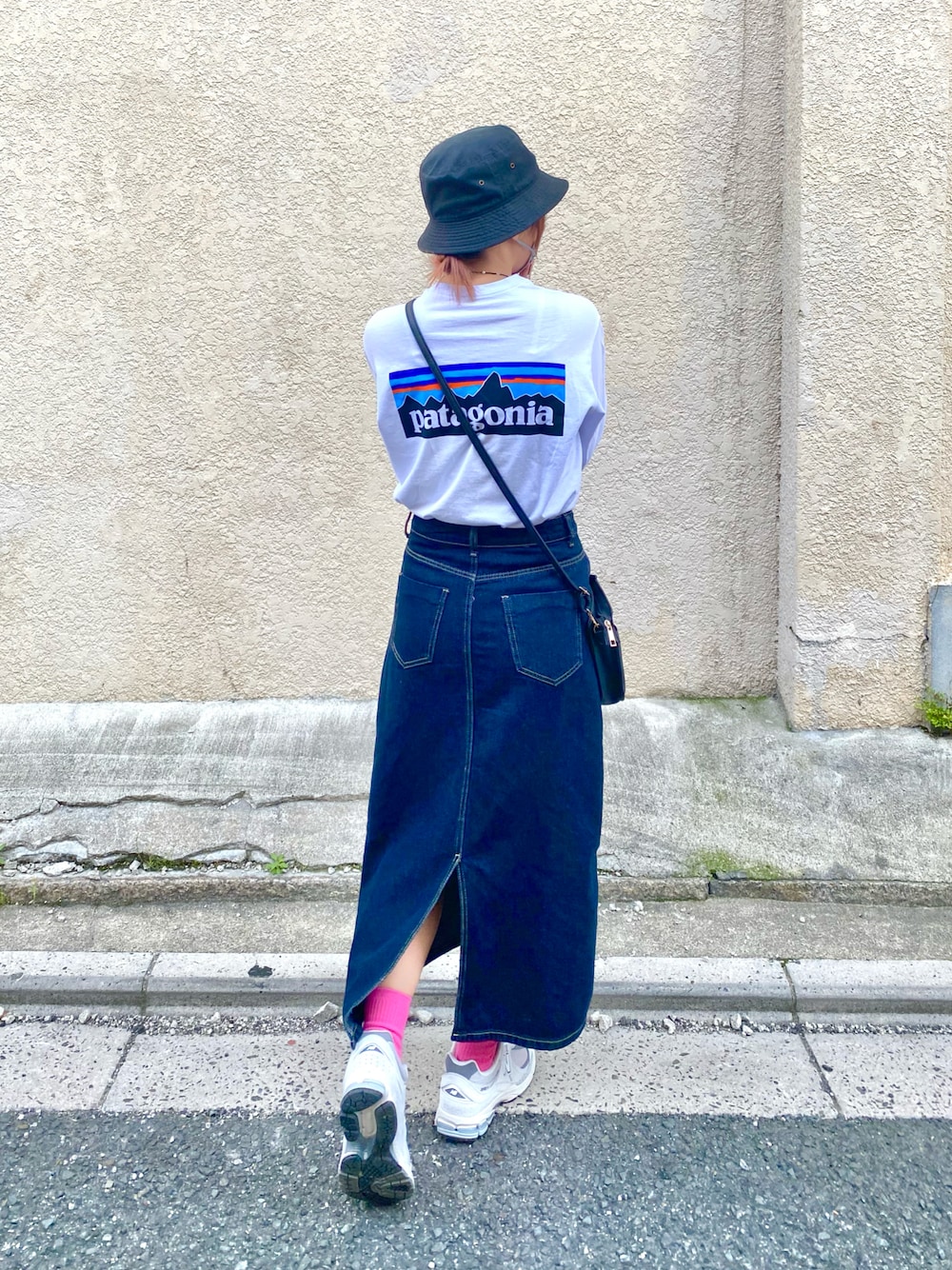Patagoniaのロゴが可愛いロンTがメインのシンプルコーデ ピンクの靴下がポイントです 💘