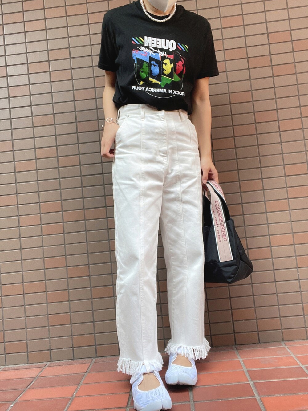 ロックTeeにデニムで辛口になりがちなのでパールで少し甘さを。 シマロンコラボのFREAK'Sのデニムはフリンジのデザインがめちゃくちゃツボ♡