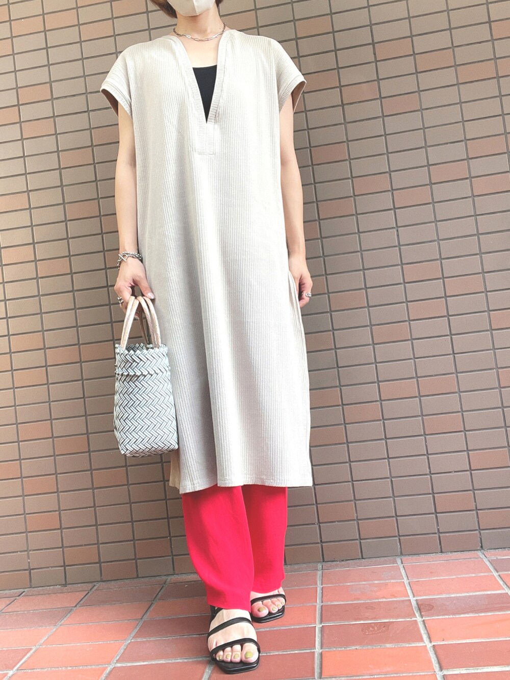 店舗委託(?)の限定商品でネットにも載ってないフリークスのワンピが着心地良すぎてお気に入り♡前からはあまり見えないけどサイドの深いスリットが可愛い(*^^*) 赤のイージーパンツをポイントに❁⃘*.゚