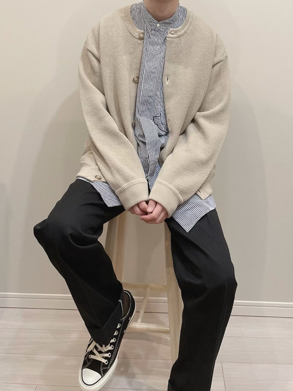 着用アイテム ・crepuscule / Moss stitch crew cardigan ・UNIQLO +J / スーピマコットンオーバーサイズスタンドカラーシャツ Mサイズ ・Dickies / THE ORIGINAL FIT 874 ・converse / CHUCK TAYLOR CANVAS OX ------------ ディッキーズの874は綺麗なストレートシルエットかつ正面から見ると丁度いい太さなので何にでも合っておすすめです。