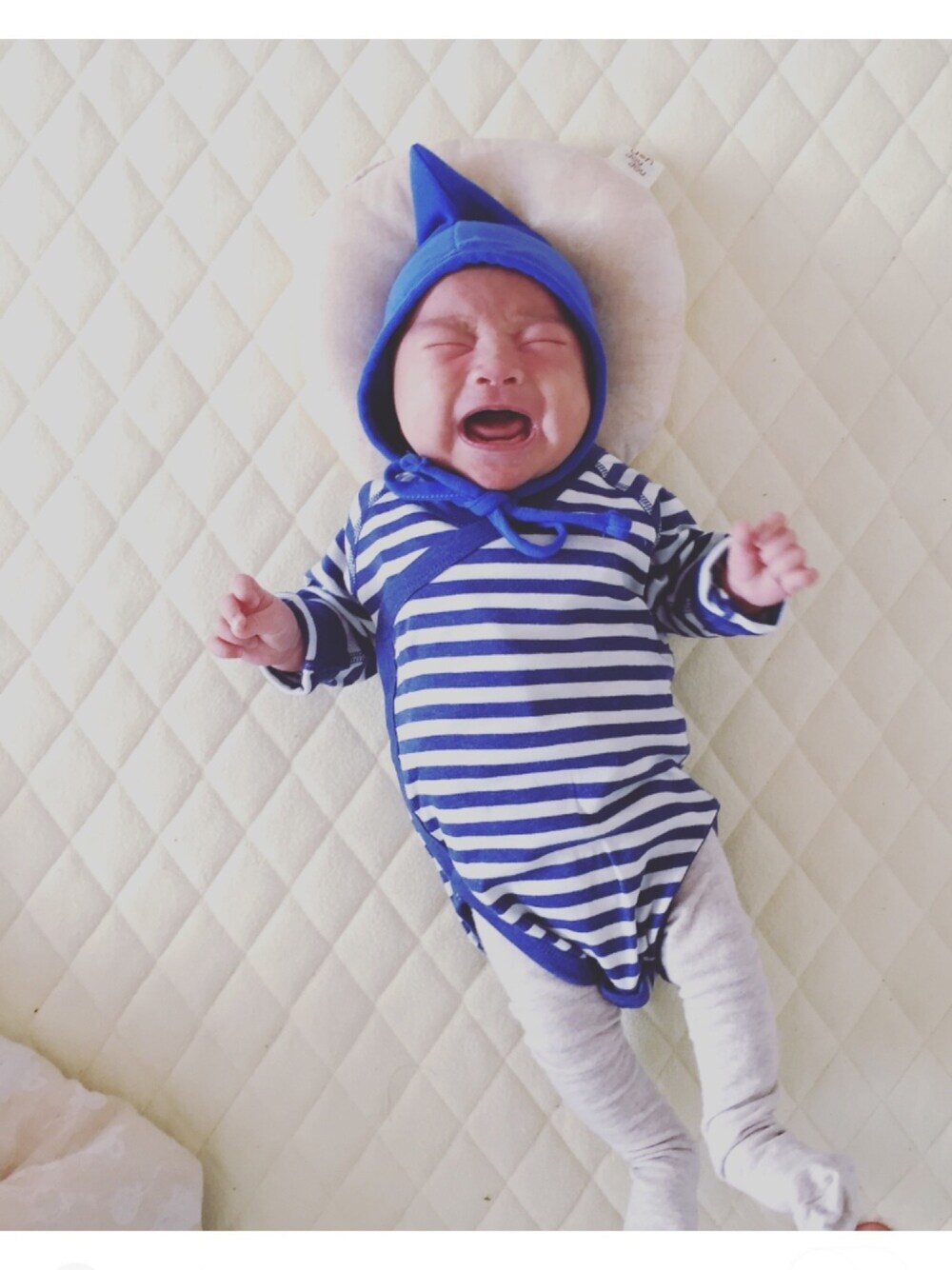 ブルー系のロンパースを着用したキッズの春コーディネートの1枚目の写真