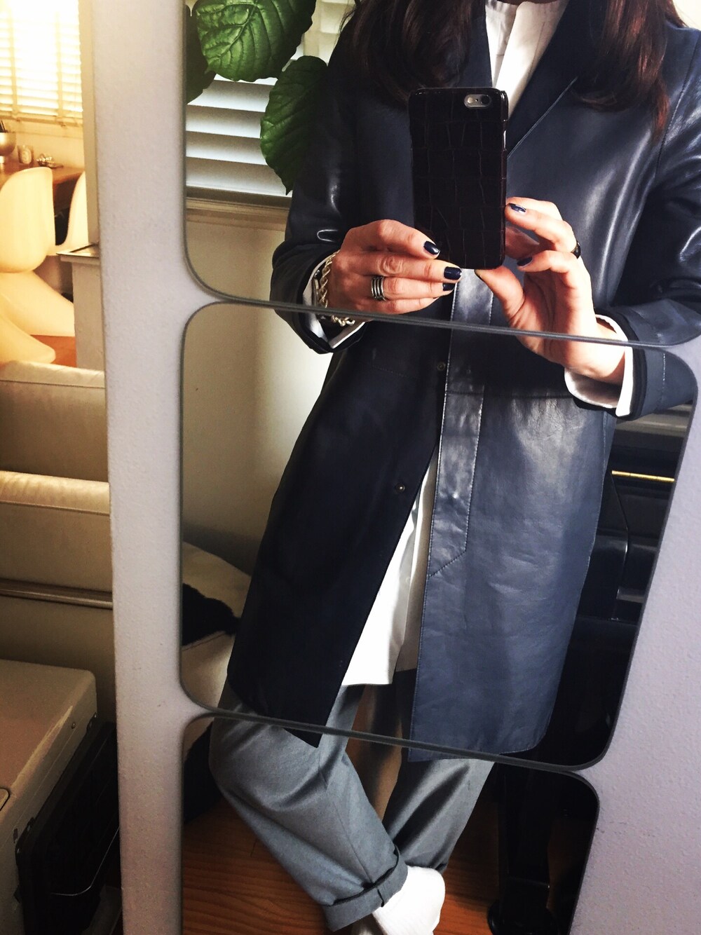 ネイビーのラムレザーのコートが最近のお気に入りです😍 柔らかくて軽くて着心地抜群‼️ ツゥモローランドとジャンポールノットとのコラボのnotのモノ〜👕