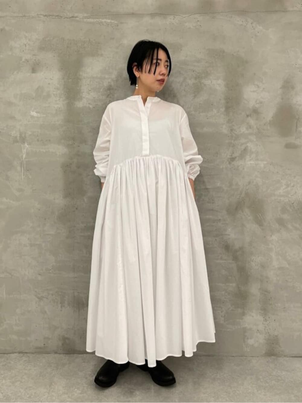 シーズンレスで使えるシャツワンピース。 タートルを重ねたり、ロングカーディガンを合わせたりいろんな着方を楽しめます。 【one-piece】1サイズ着用 160cmでくるぶし上の着丈。白は透け感があるので、一枚で着たい時は他のペチコートを合わせると良いと思います。私は白いインナーに白パギンスを合わせています。ブラックのタートルを重ねている時は黒のタイツを履いています。