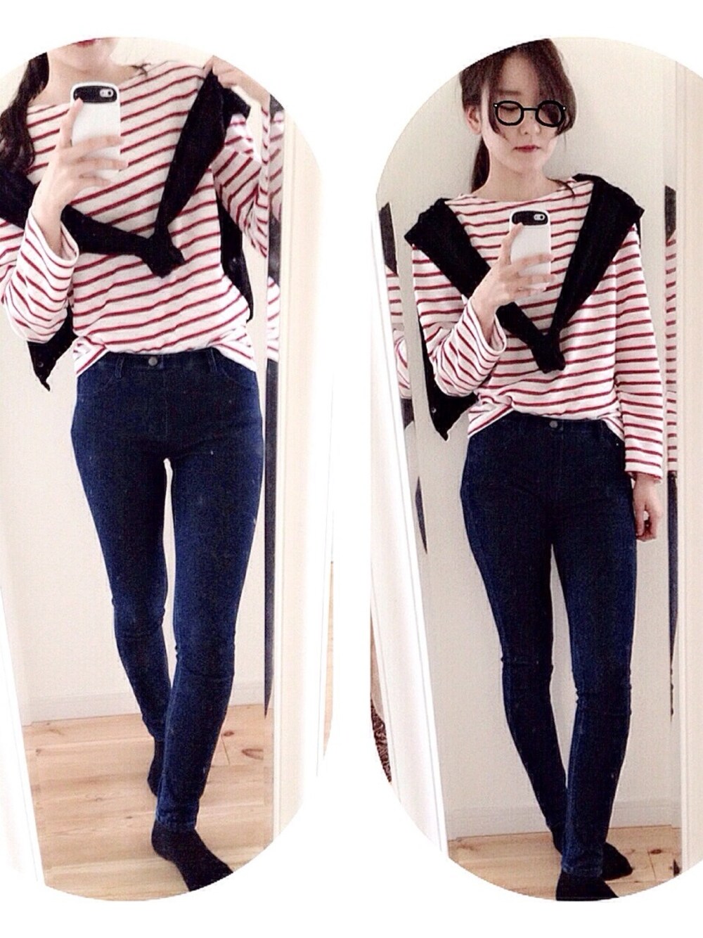レッド系のTシャツ/カットソー、ブルー系のデニムパンツ、ブラック系のカーディガン/ボレロを着用したレディースの春コーディネートの1枚目の写真