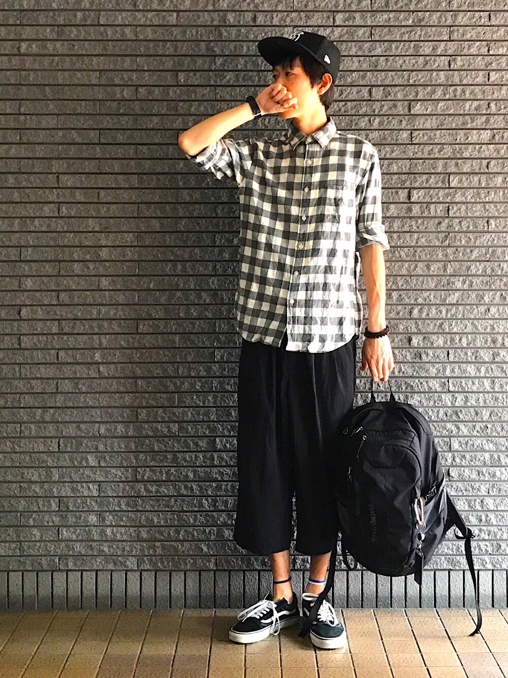 ブラック系のスニーカーを着用したメンズの春コーディネートの1枚目の写真