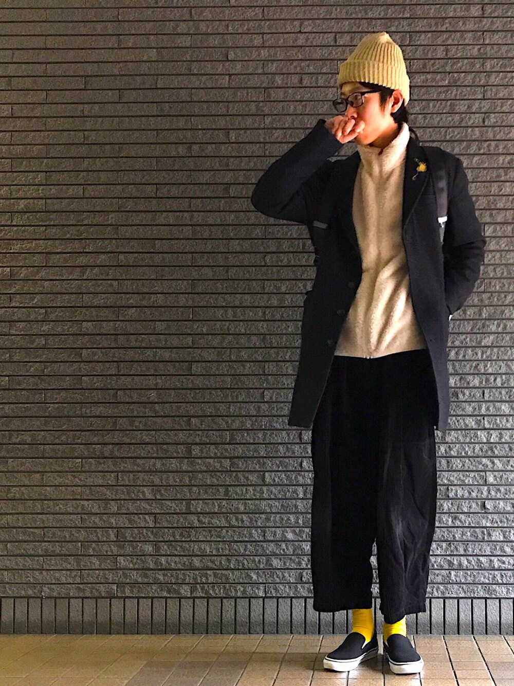 ブラック系のスニーカーを着用したメンズの冬コーディネートの1枚目の写真