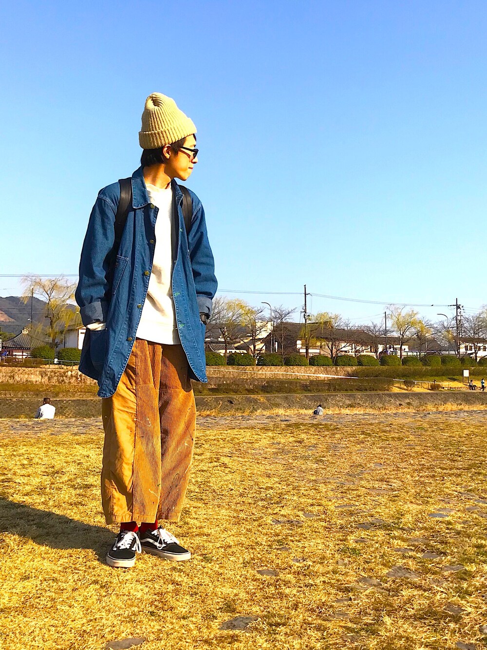 ブラック系のスニーカーを着用したメンズの春コーディネートの1枚目の写真