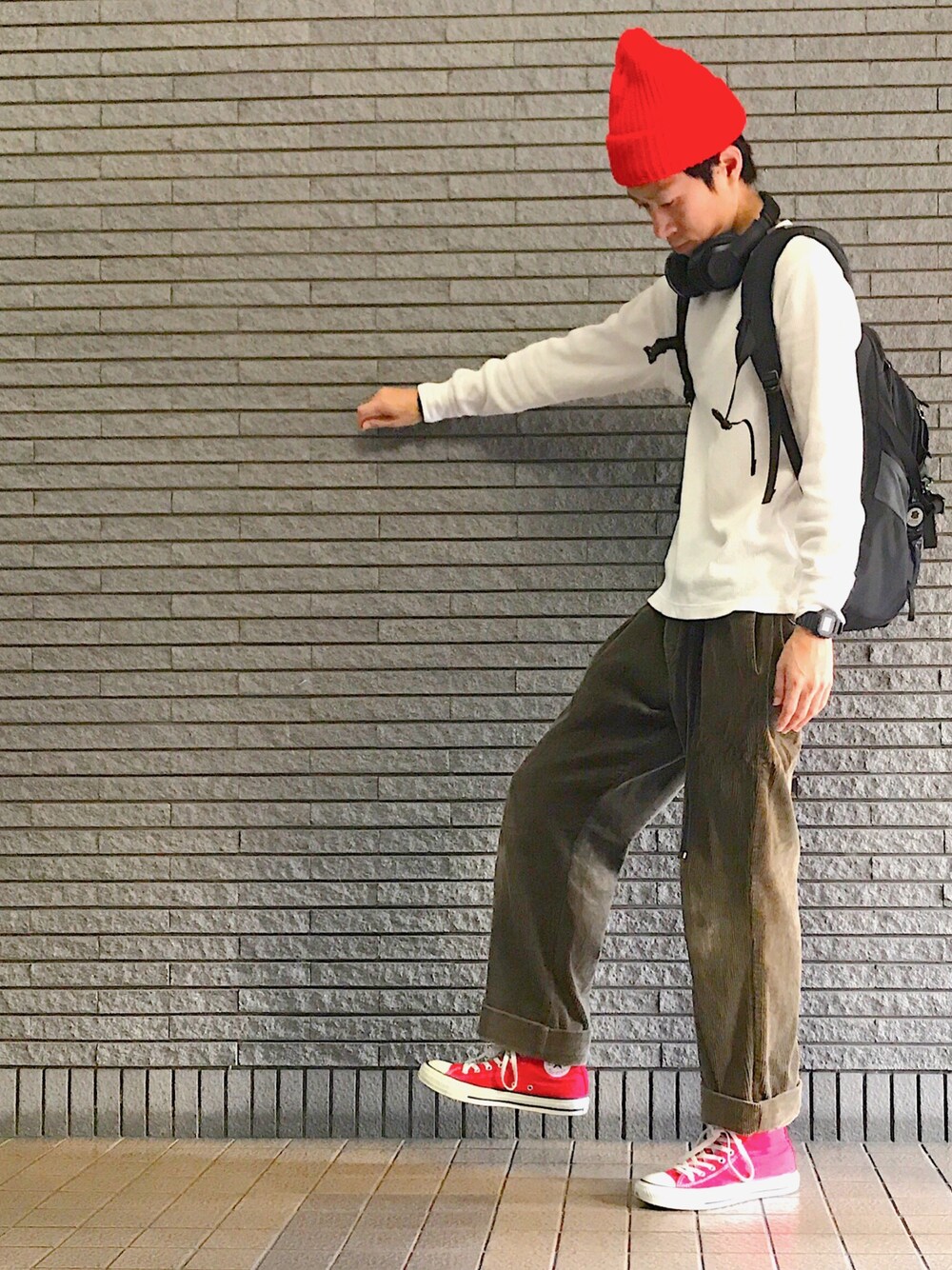 レッド系のスニーカーを着用したメンズの秋コーディネートの1枚目の写真