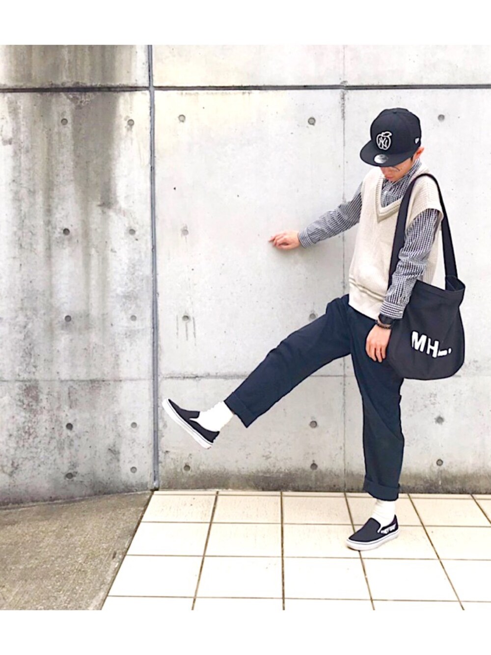 ブラック系のトートバッグを着用したメンズの春コーディネートの1枚目の写真