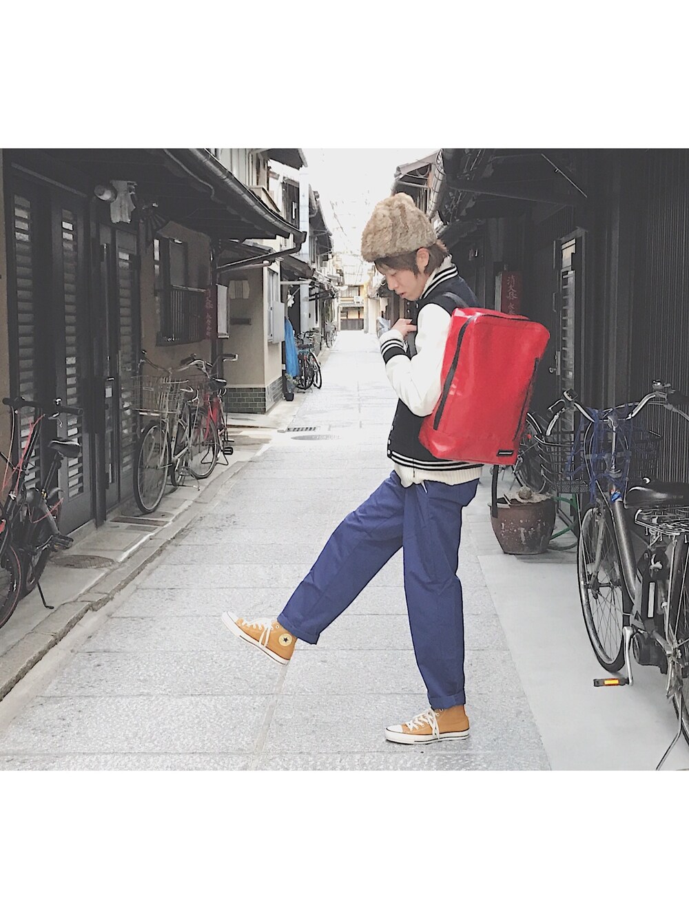 ゴールド系のスニーカーを着用したメンズの冬コーディネートの1枚目の写真