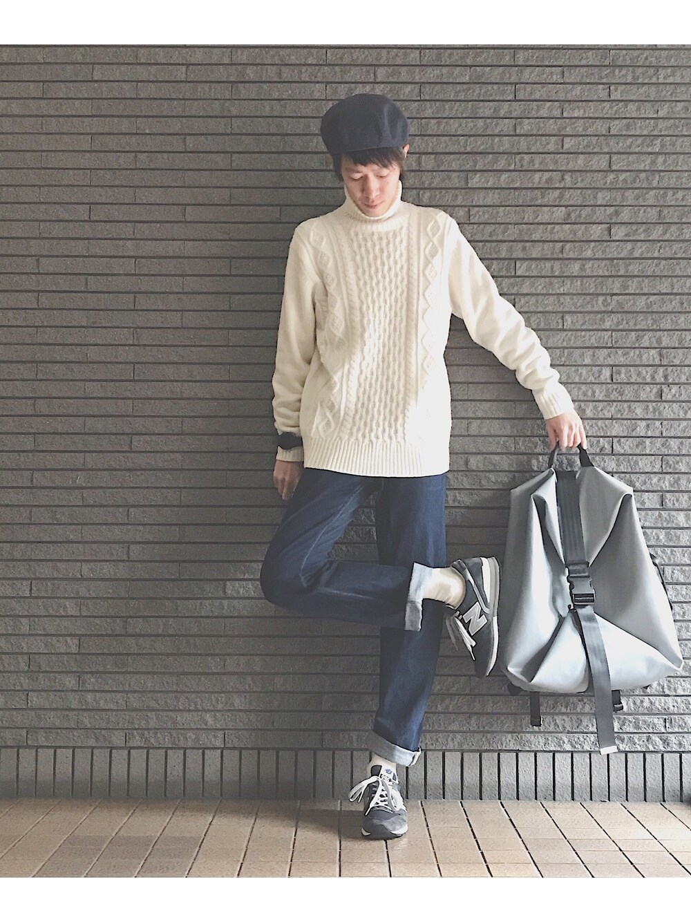 ブルー系のスニーカーを着用したメンズの冬コーディネートの1枚目の写真