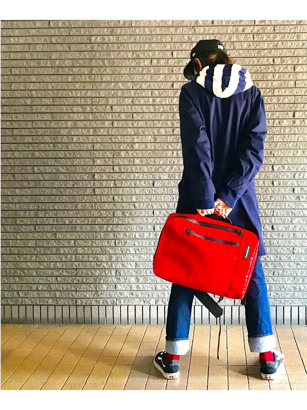 ブラック系のスニーカー、レッド系のバックパック/リュックを着用したメンズの春コーディネートの1枚目の写真
