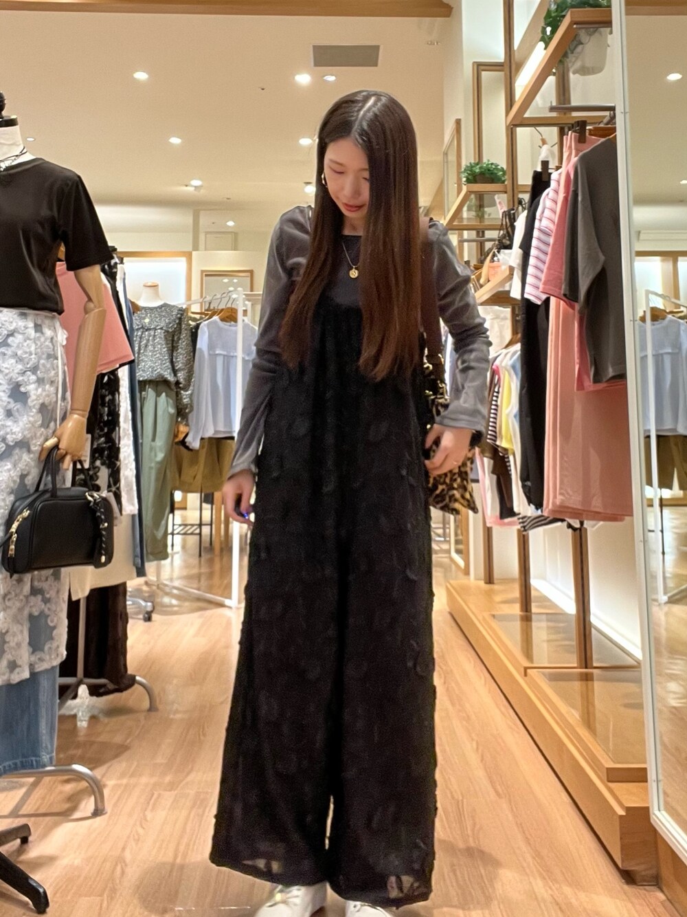 ご覧いただきありがとうございます(^^) デートにも使いやすいブラックコーデです❤︎ 身体のラインをひろわず安心です✨ サロペットですがきれいめに使いやすい1枚! 3D刺繍生地で可愛いです!