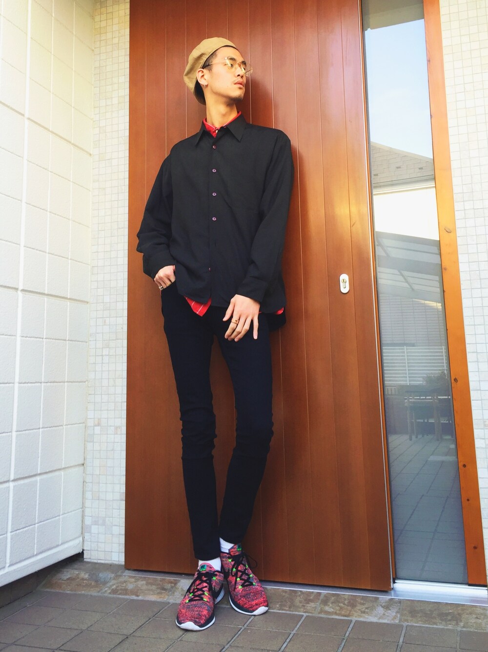 ピンクのフライニット久しぶりに履いたけど、ちょっと浮いてる😒 シャツonシャツ