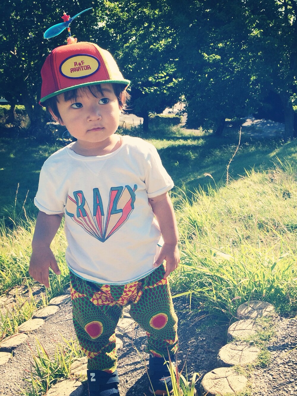 minneで購入したアフリカンバティックのパンツにタケコプター付キャップをあわせてフェススタイル。