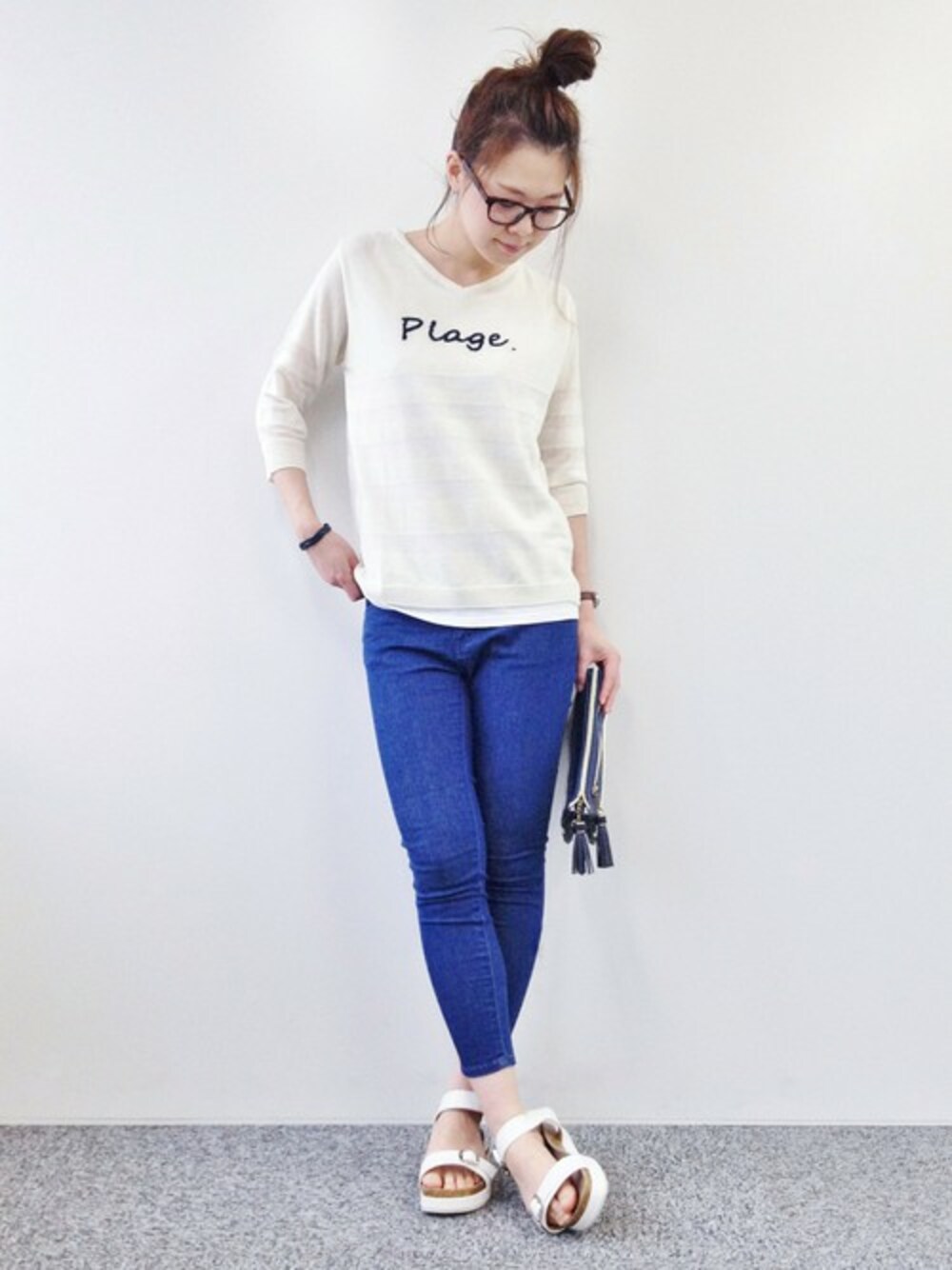 白ニットにデニムの至ってシンプルなコーデですが ニットはボーダーに透けていて、涼しげな要素。 クロップド丈やサンダルで軽さを出して春夏使用に(^_^)/★