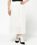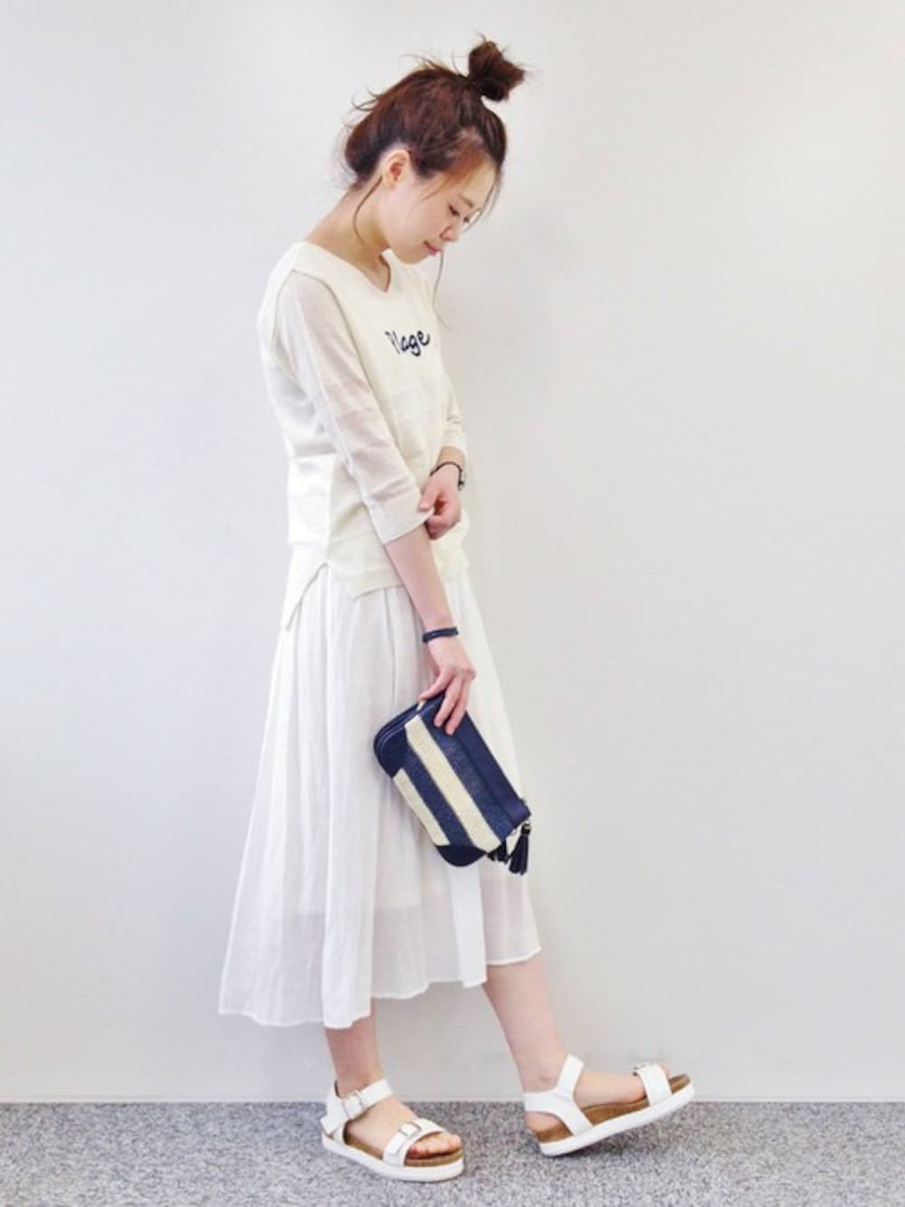 ゆるっと可愛いオールホワイトコーデ! たっぷりギャザーの入ったスカートは 透け感のあるさらっと春夏使用。おススメです★(^_^)/ すっきりまとめたおだんごヘアー、サンダル、 ボーダーのクラッチでぐっと涼しげに♪
