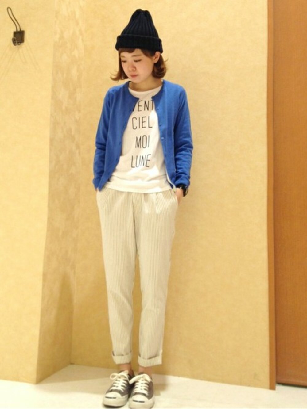 ストライプのパンツをロールアップしてボーイッシュなコーディネートに。 プリントT×カーディガンの程よいゆるさもポイントです♪