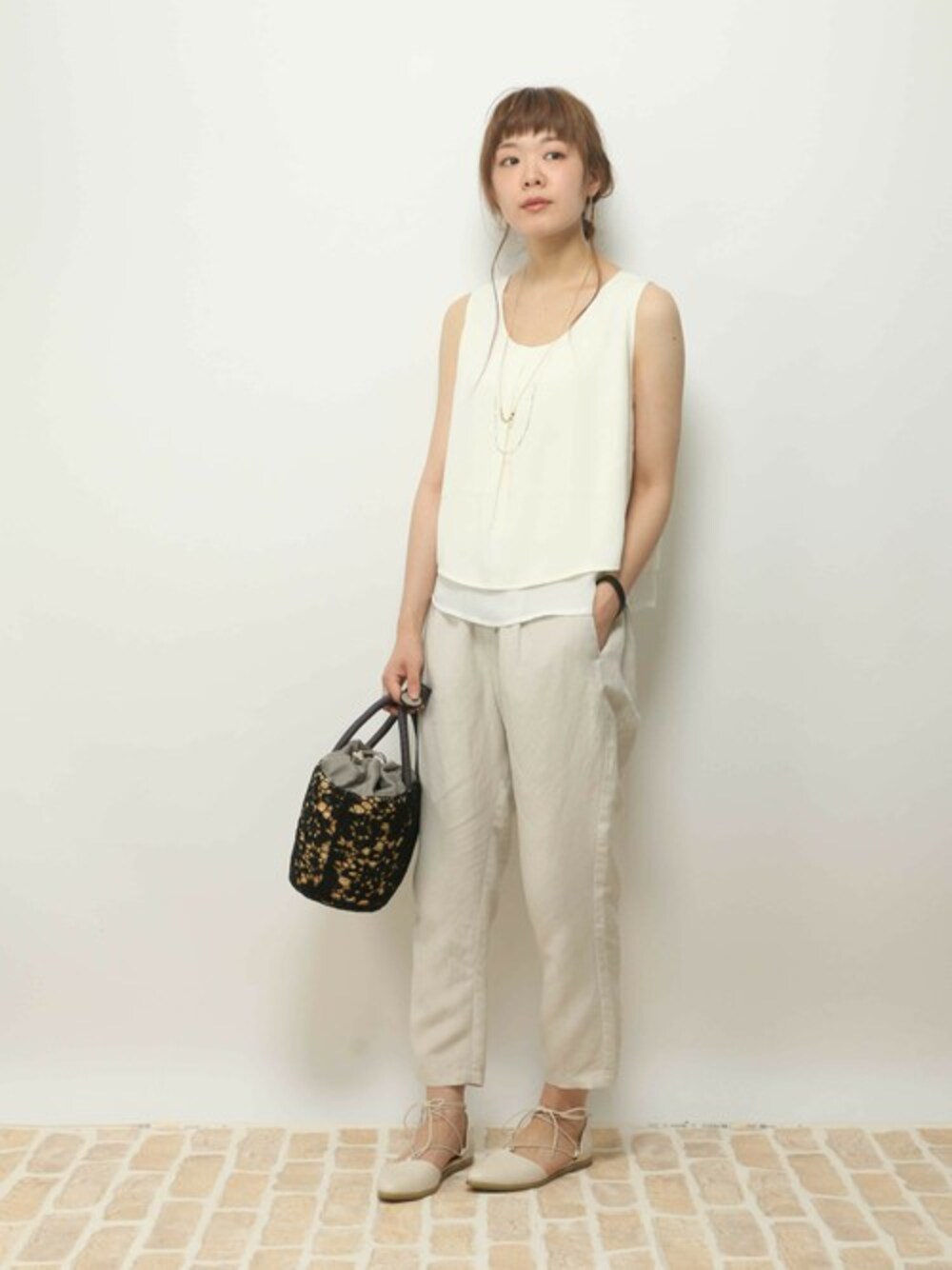風をはらんでふわりと揺れるシフォン素材のブラウス リネンのパンツと合わせてゆるめにまとめてみました。 寂しくならないようレースのかごバッグを。