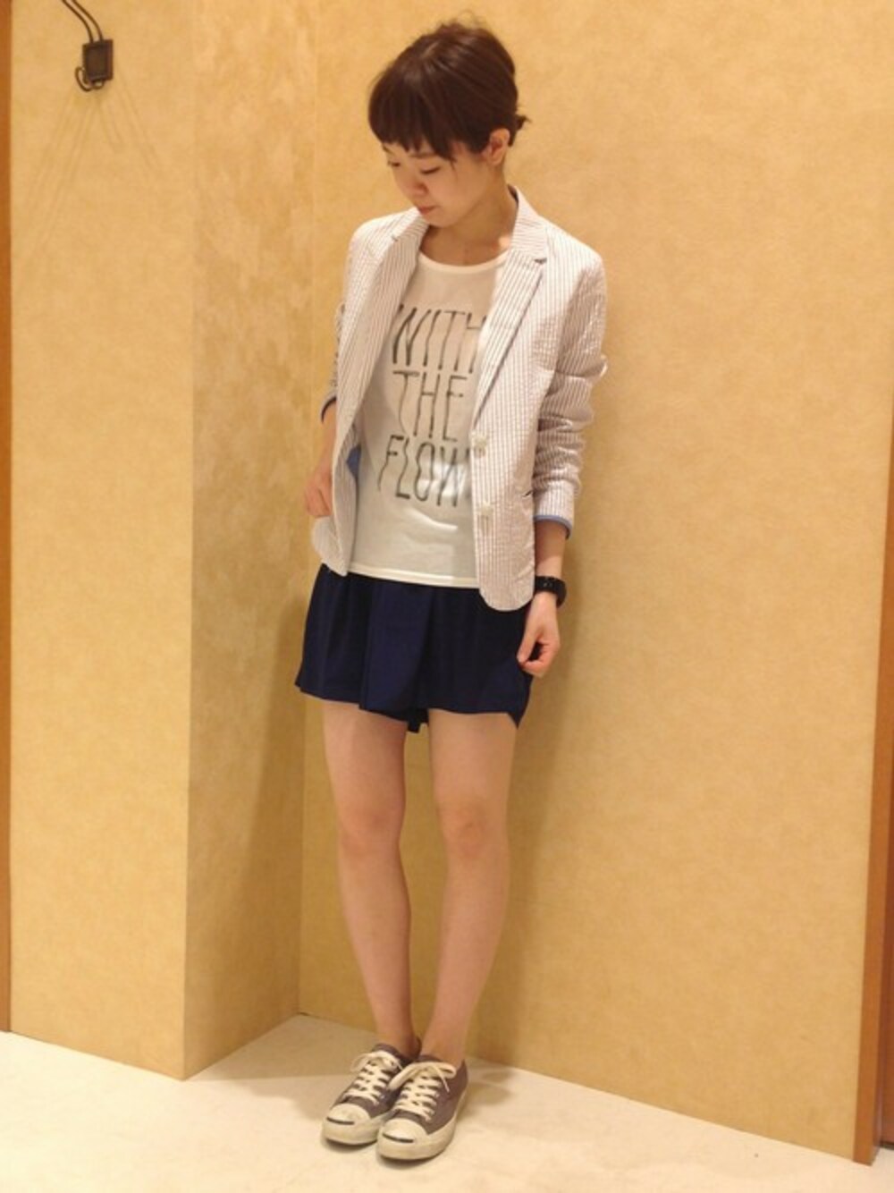 ジャケットとショート丈ボトムのコンパクトなバランス感が絶妙なコーディネート。 涼しげなサッカー生地のシャツ感覚で着られるジャケットは、Tシャツ合わせのラフなスタイリングがおススメです。 薄手の素材なので袖をロールアップして着こなしても◎