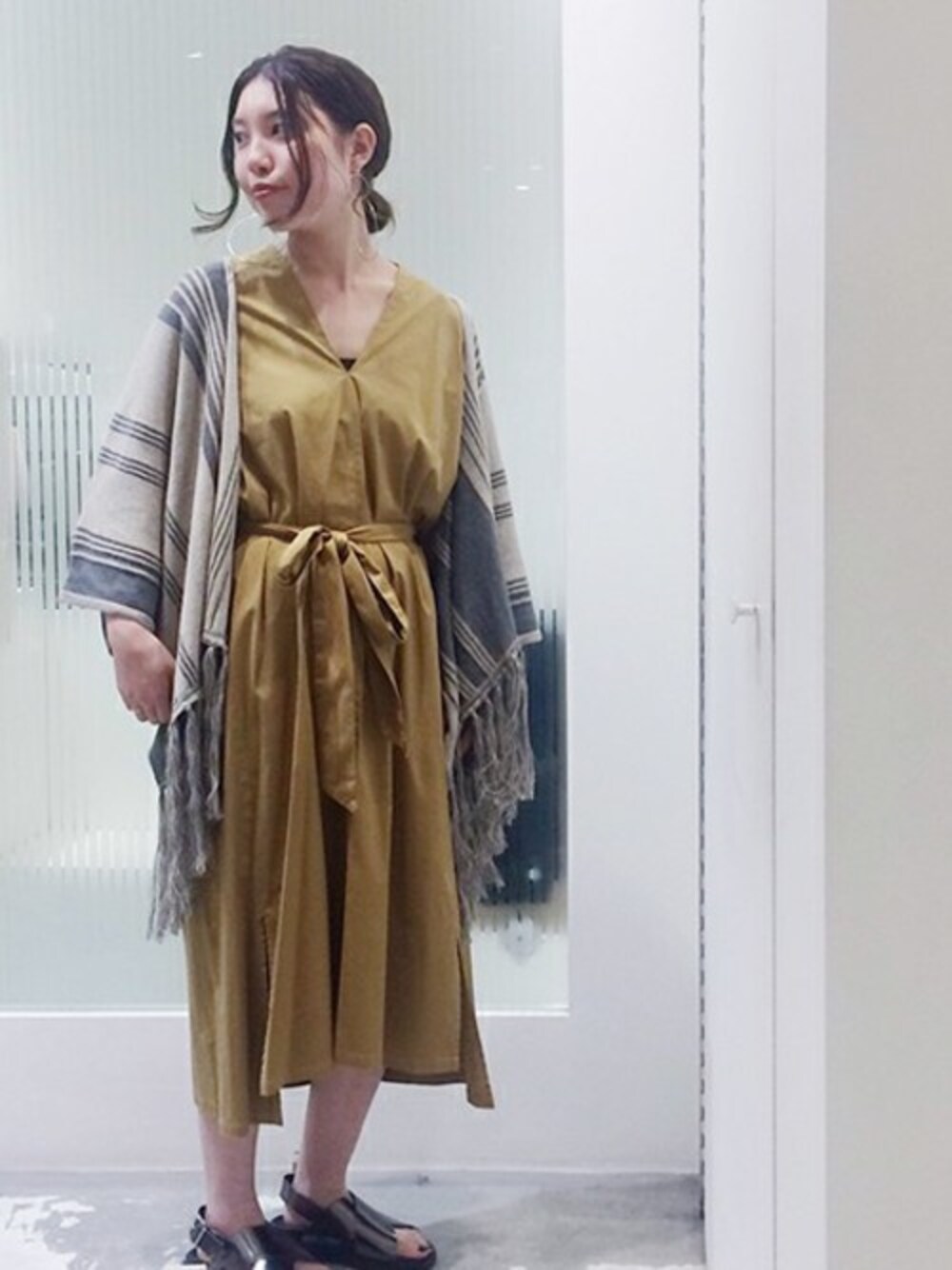 楽ちんなワンピでも、ウエストリボンで上品な見え方に◎ ポンチョカーデは、今時期、冷房対策や日よけにもなり便利ですー!