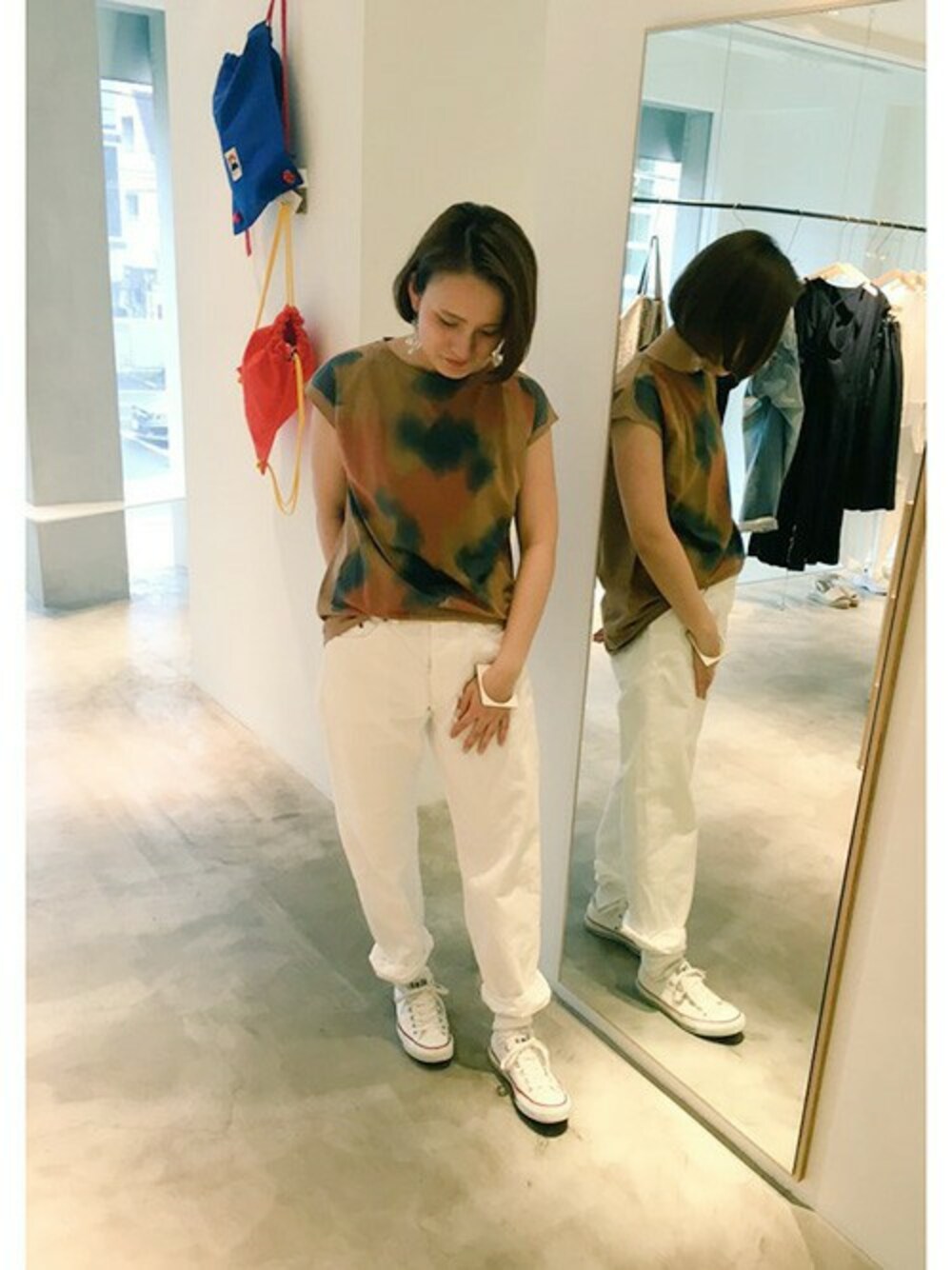 ホワイトデニムと 白スニーカー。 トップスは、ダーク寄りに。