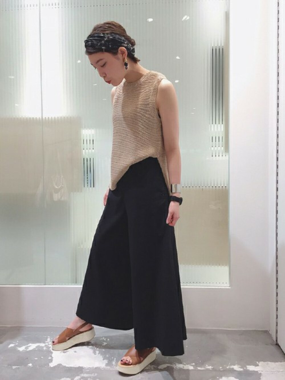 ふわっと綺麗なスーパーフレアパンツは コンパクトなサマーニットと合わせて グッと爽やかに、夏らしく◎