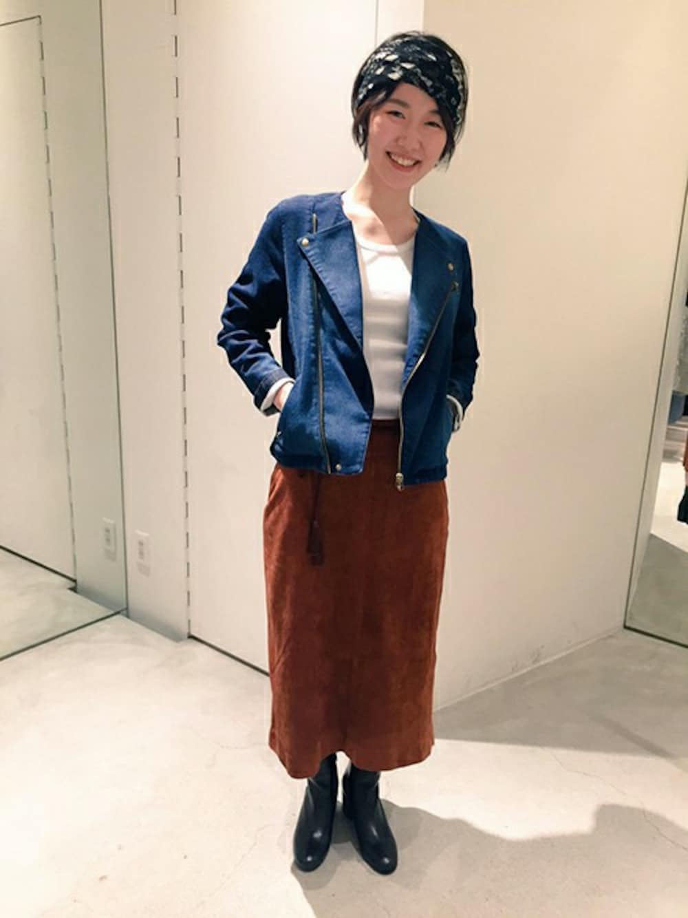 note et silence.のライダースジャケット「インディゴ裏毛 ライダースブルゾン」を使ったコーディネート