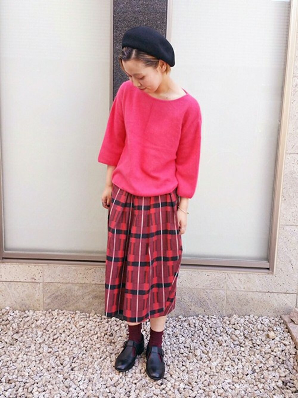 ゆるくて、ふわふわニット チェックのコクーンスカート 秋コーデ