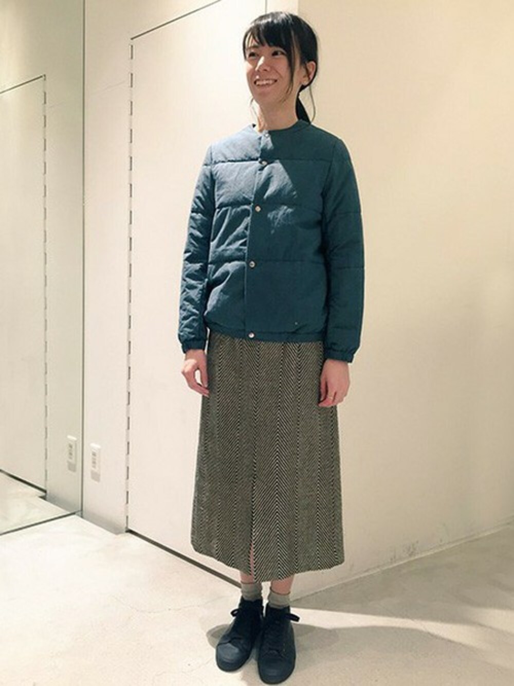中綿キルティングブルゾン コンパクトで シンプルなデザインが◎ くすんだグリーンがオススメです。
