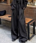全身をブラックで統一し、素材の質感と流れるようなシルエットで魅せる、洗練されたモード系のコーディネートです。 トップスはシワ感のある独特な風合いの羽織り(シャツジャケット風)で、共布のベルトでウエストをマークすることで、美しいドレープとメリハリのあるラインを創出。袖もワイドで、全体のボリューム感を強調しています。 ボトムスには、滑らかで落ち感のある生地のスーパーワイドパンツを合わせ、床に届くほどの丈感で、優雅なドレープを際立たせています。 Instagram nowle_official 🦉