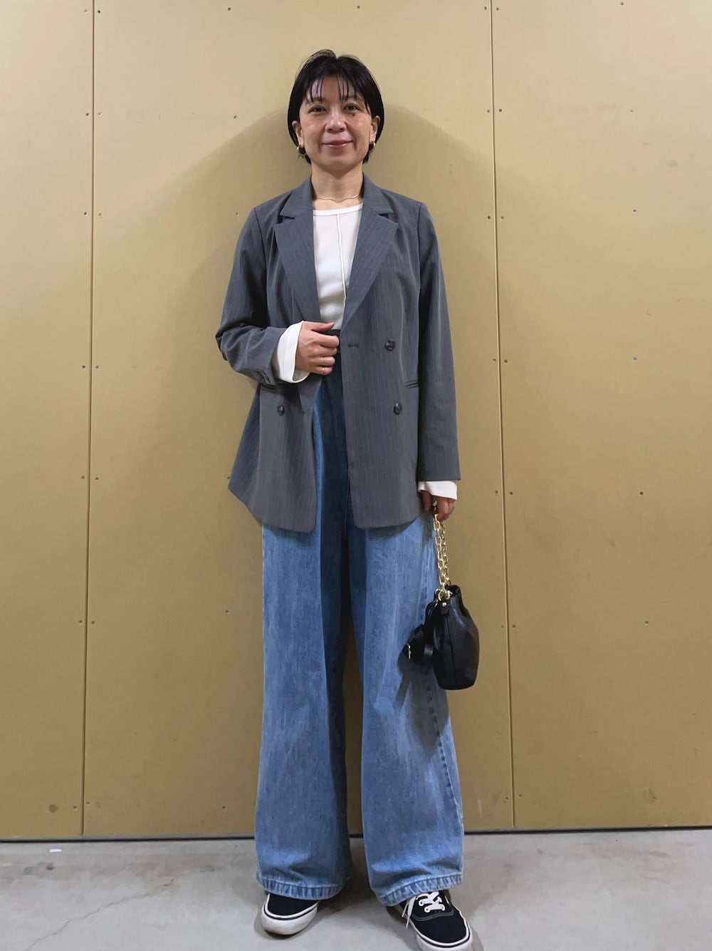 ⭐︎ストライプジャケット 季節の変わり目に1着あると万能なテーラードジャケット。 強調し過ぎない控えめなストライプ柄なのでコーディネートの邪魔にならず、タイト過ぎない適度に余裕のあるシルエットも幅広いスタイリングに合わせやすくて良いです♪ 38サイズ着用、腰まわりが隠れるくらいの長さでパンツ、スカート選ばず合わせやすいです。 ボトムスにデニム、スニーカーを合わせてカジュアルにまとめてみましたが、コーディネート次第で色々なシーンにご利用いただけます◎