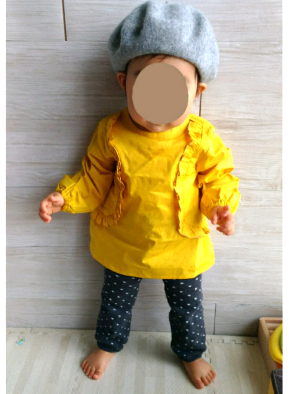 マスタードイエローの秋色トップスはフリルが可愛い💞 従兄妹からのお下がりでもらったレギンスは無印良品のもの。 色違いで何本もあるくらい、履かせやすい。