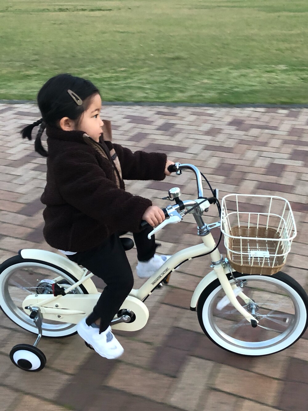 寒い日の夕方の特に寒い時間帯に、自転車の練習に行くとの事… 完全防備で中にダウンベストまで着て行きました