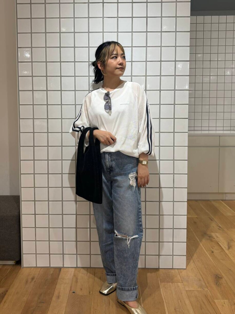 いつもご覧いただきありがとうございます🙏 Instagram▶︎▶︎@7gi__sa_4 メッシュトップスを使ったコーデのご紹介です🤍 こちらのメッシュトップスは袖にラインが入っているデザインで、今っぽさもあり手軽にスポーツミックスできるアイテムです◎ 通気性もいいので、まだまだ暑いこの季節感にもピッタリです! シンプルにまとめましたが、カバンやシューズでラメやツヤ感がある物でスポーティすぎないように組み合わせました👍🏻 カバンも折りたためるくらい柔らかい素材でラメ感も強くないのでコーデの➕1として使えます!! ぜひ、店頭・WEBでご覧下さい😌