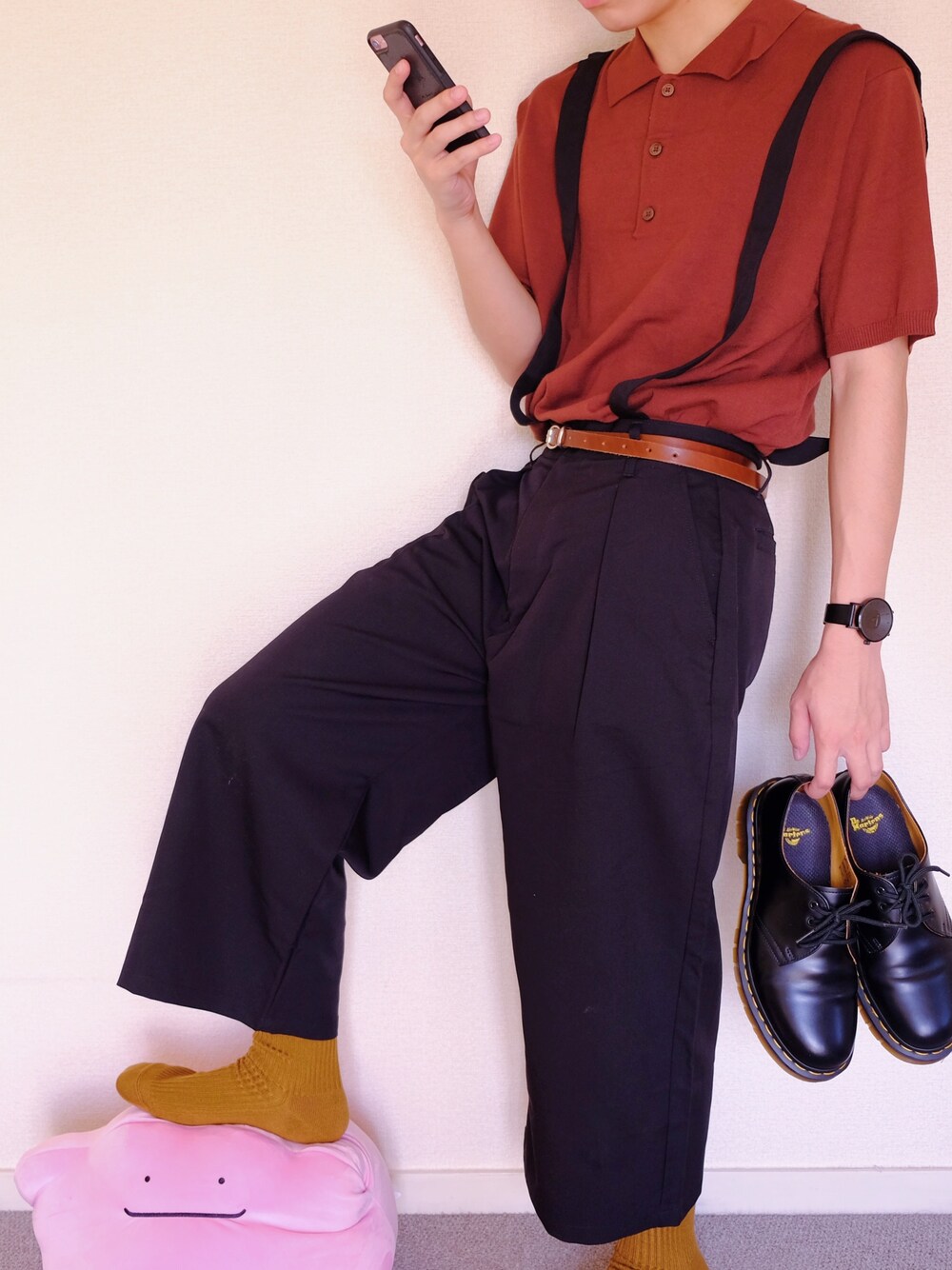 npuddin のスラックス「【ZIP FIVE】ワイドシルエット ルーズスラックスパンツ【サスペンダー付き(取り外し可能】」を使ったコーディネート