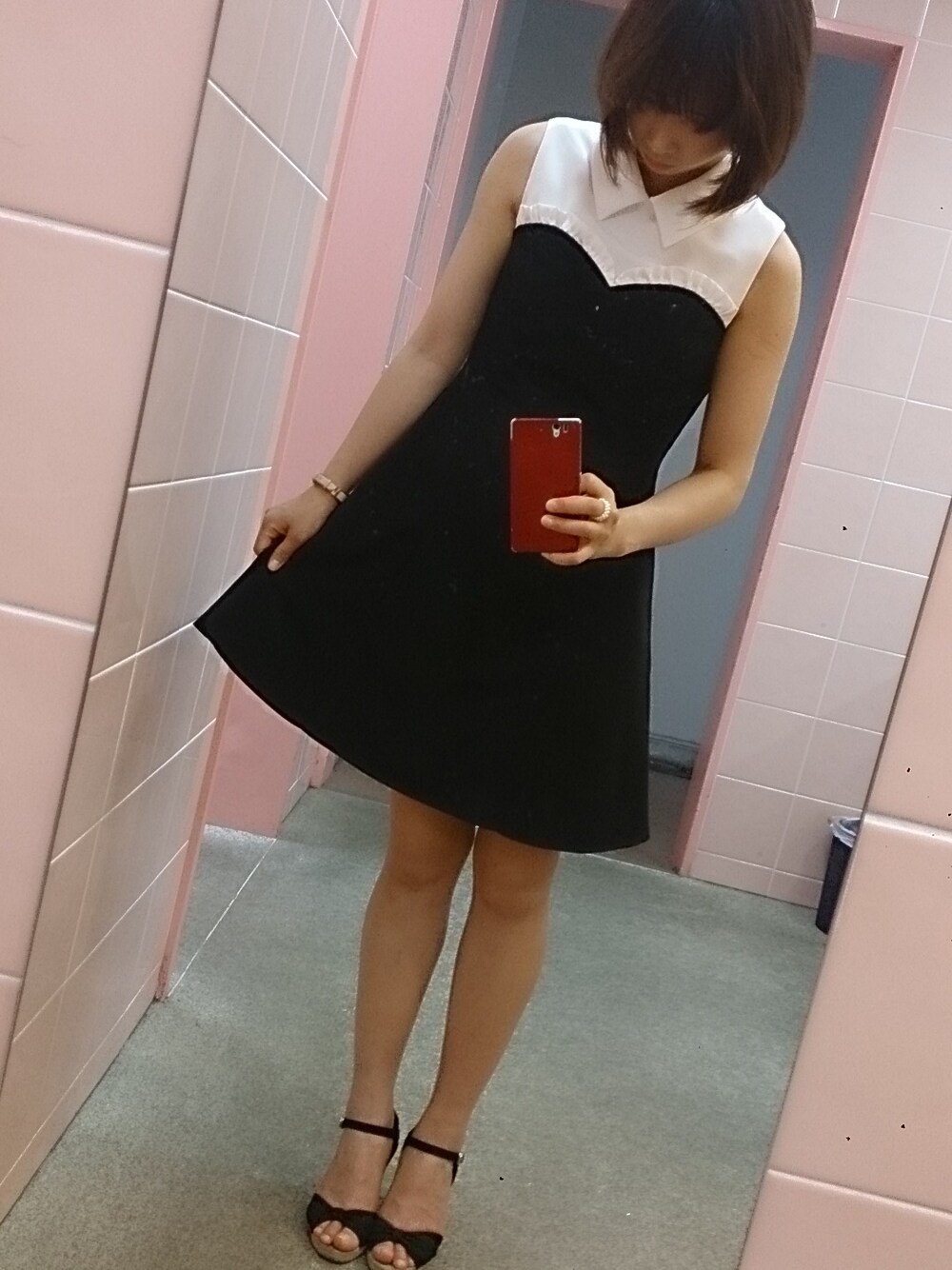 ブラック系のワンピースを着用したレディースの夏コーディネートの1枚目の写真