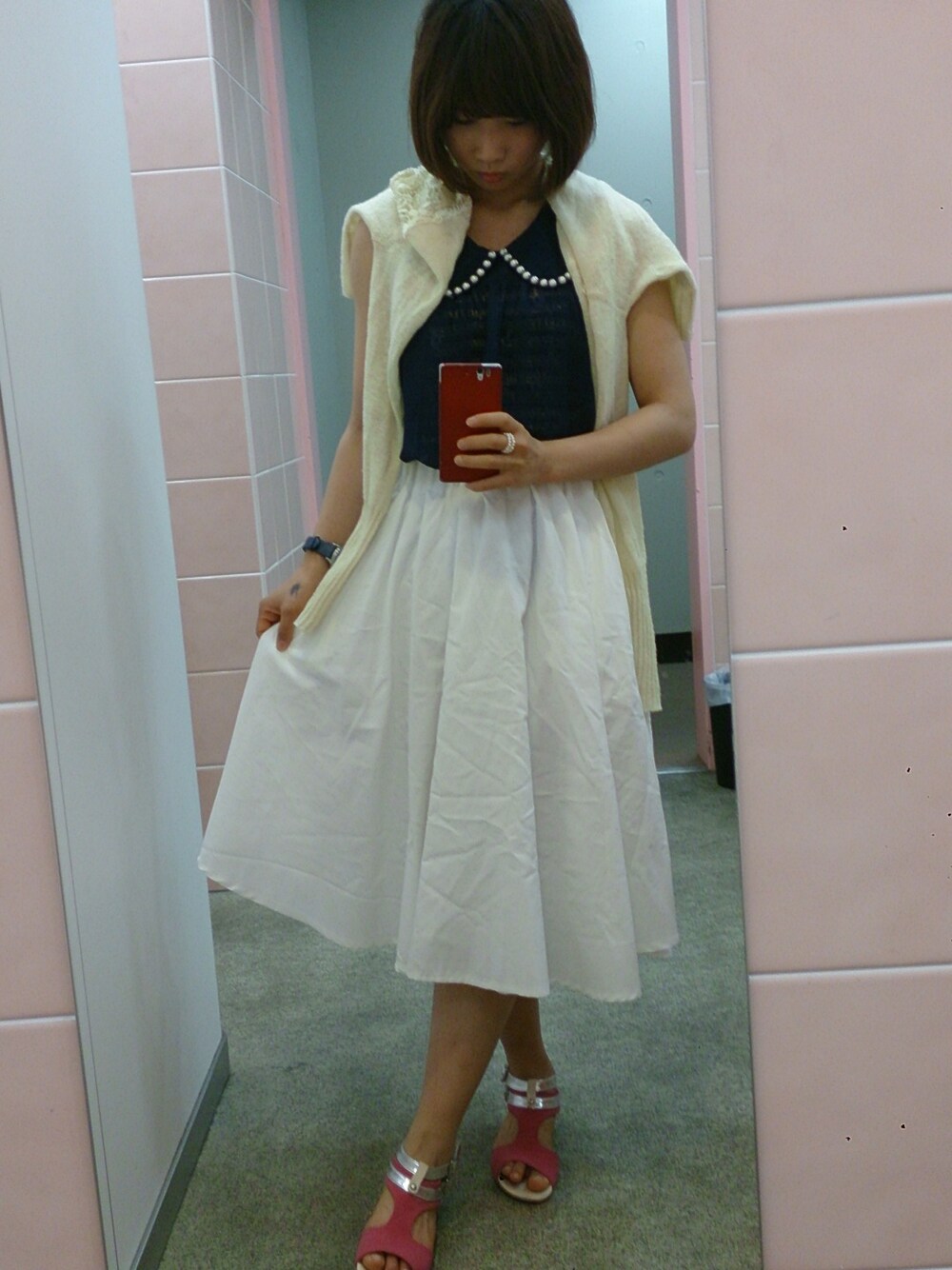 ねーむいっ おはよーございます。 今日も安定の学校からのバイト。 一限から五限まで。つらお。 ラストまで。つらお。 ひざ丈スカート! 麻!らくちん!!! ホワイト×ネイビー! いいね! 差し色ピンクとイエロー! いいね! 自分で言うな!てへ ではでは。