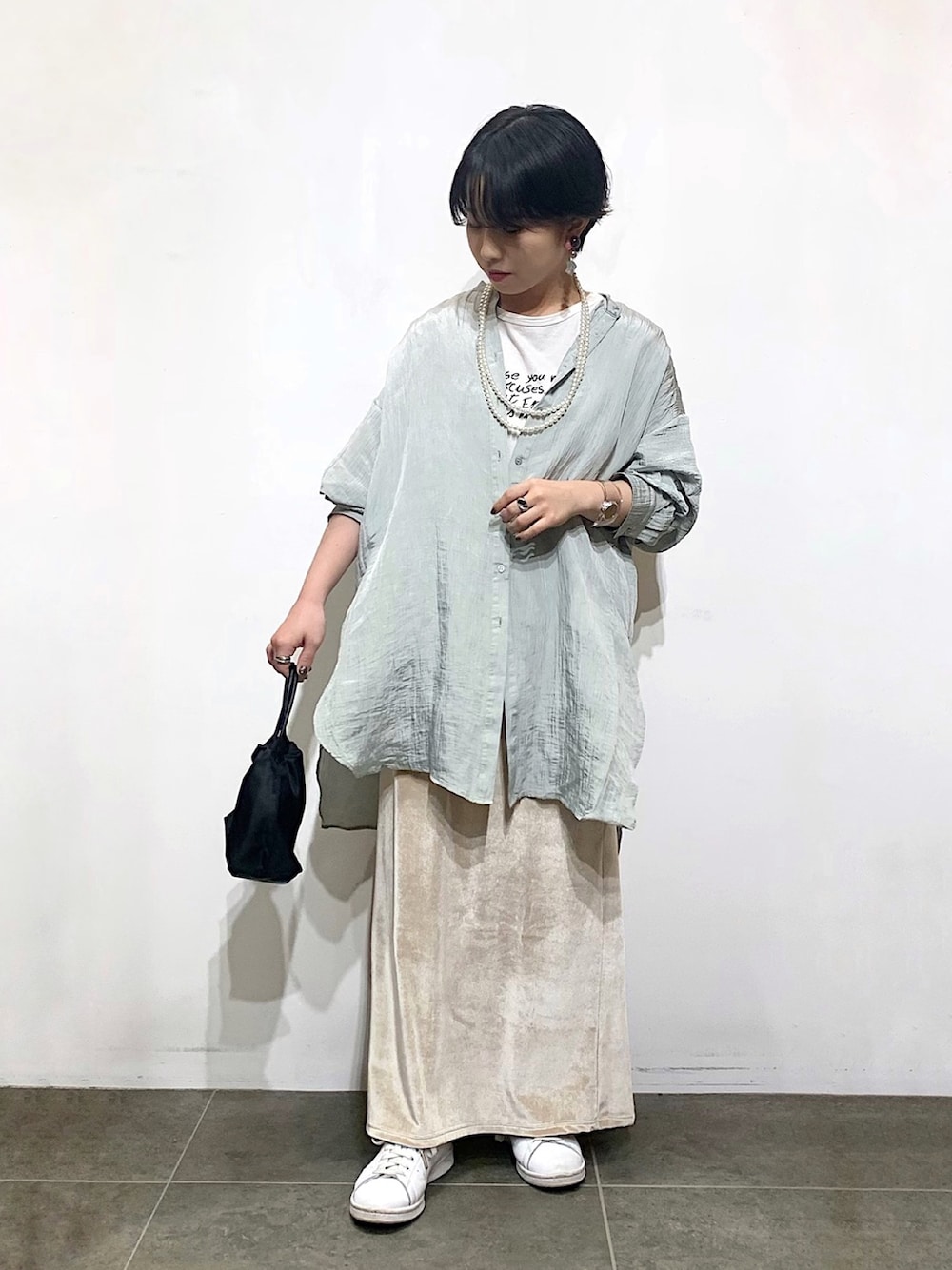 ━━━━━━━━━━━━━━━━━━━━━━━━ ふんわり軽く、揺れ感がたまらなく可愛いおすすめのシャツ 𓍯 色味とこのワッシャー加工が "1枚着るだけおしゃれ" になれて、1枚持っておいて損なしのアイテムです! ベロアスカートは程よい光沢感が女性らしく、うしろにはスリットも入ってるので足捌きが良いです👌🏻♥ ━━━━━━━━━━━━━━━━━━━━━━━━